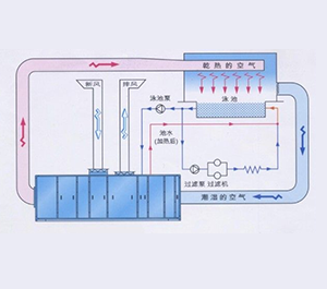 第二步,冷媒吸收的熱能,首先(潛熱)經(jīng)熱交換器加熱池水,實(shí)現(xiàn)池水加熱功能;余熱(顯熱)經(jīng)空氣冷凝器,加熱冷卻的室內(nèi)空氣,實(shí)現(xiàn)空氣恒溫功能。
