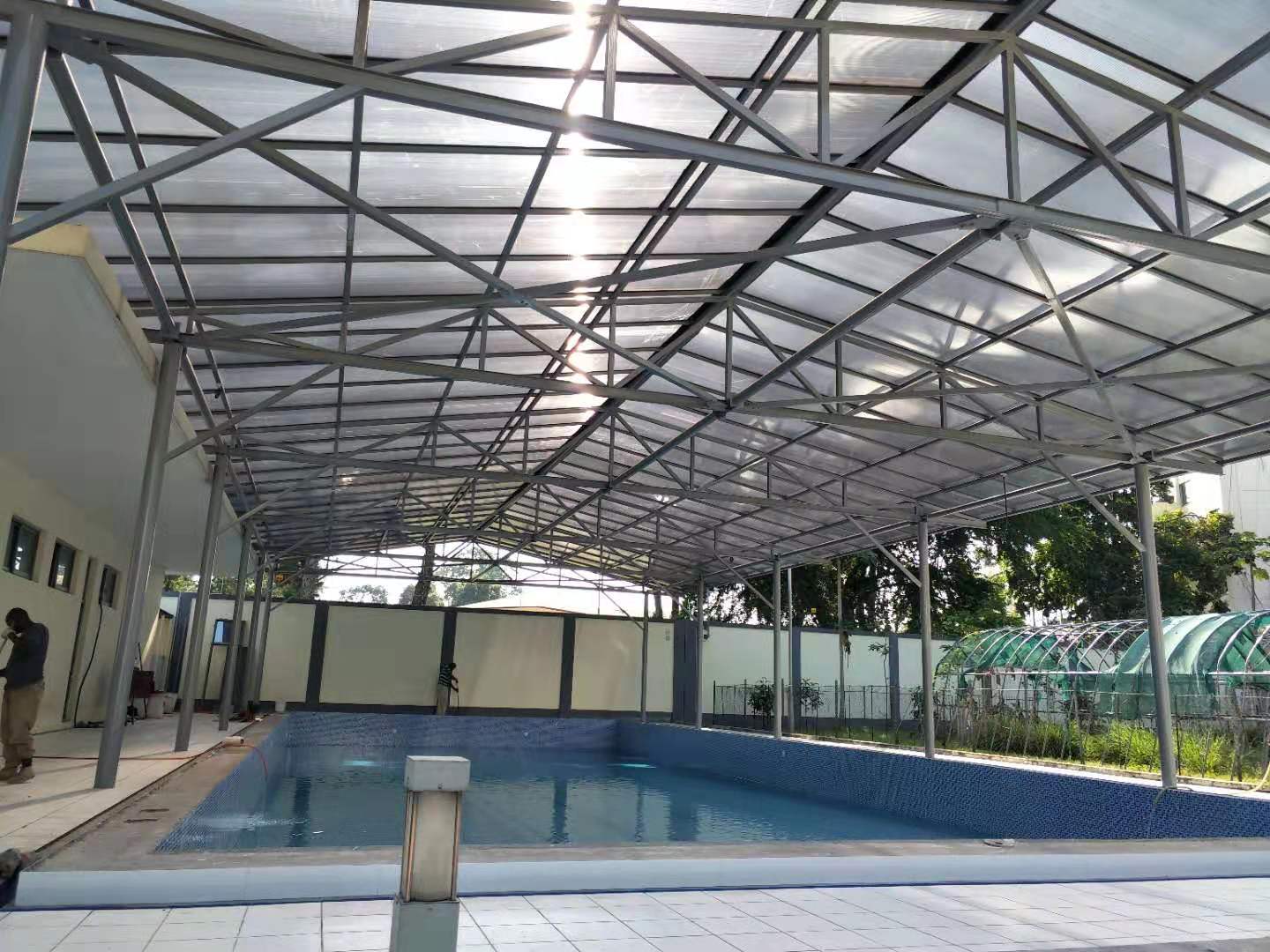 中國駐剛果(布)大使館泳池項目為改造工程,總水量550m3,原來的設(shè)備已經(jīng)嚴(yán)重老化,不能正常使用,我公司于2019年9月承接該泳池的水處理改造,已經(jīng)于2020年1月施工驗收完畢,目前已經(jīng)正常投入使用。